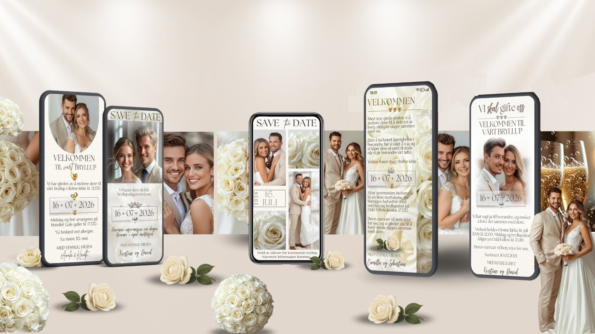 Vi tilbyr invitasjoner, "save the date", video invitasjoner, menyer, bordkort og takkekort – tilpasset deres stil, farger og tema. Velg blant moderne, romantiske og klassiske design, og skap et helhetlig uttrykk som forteller deres historie.