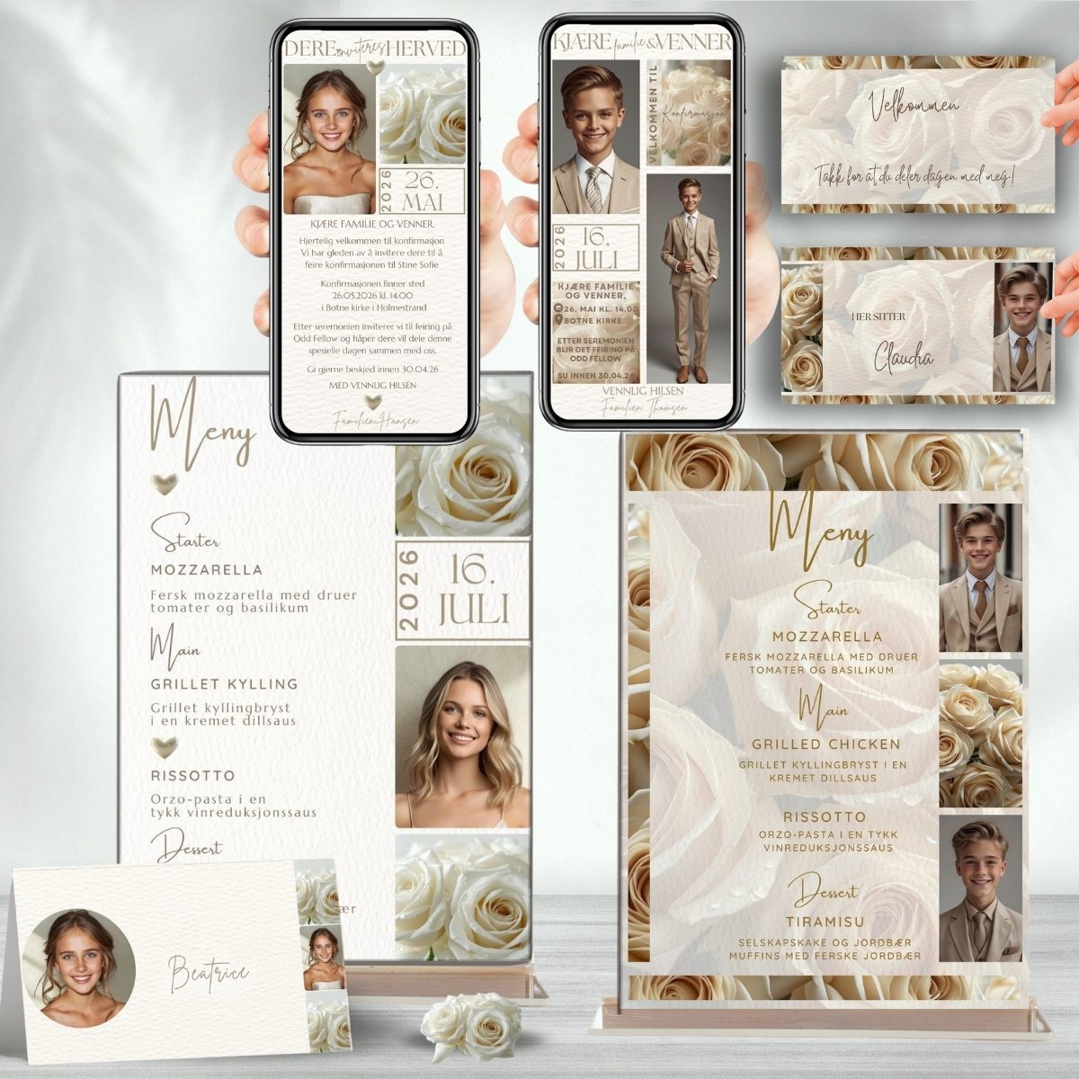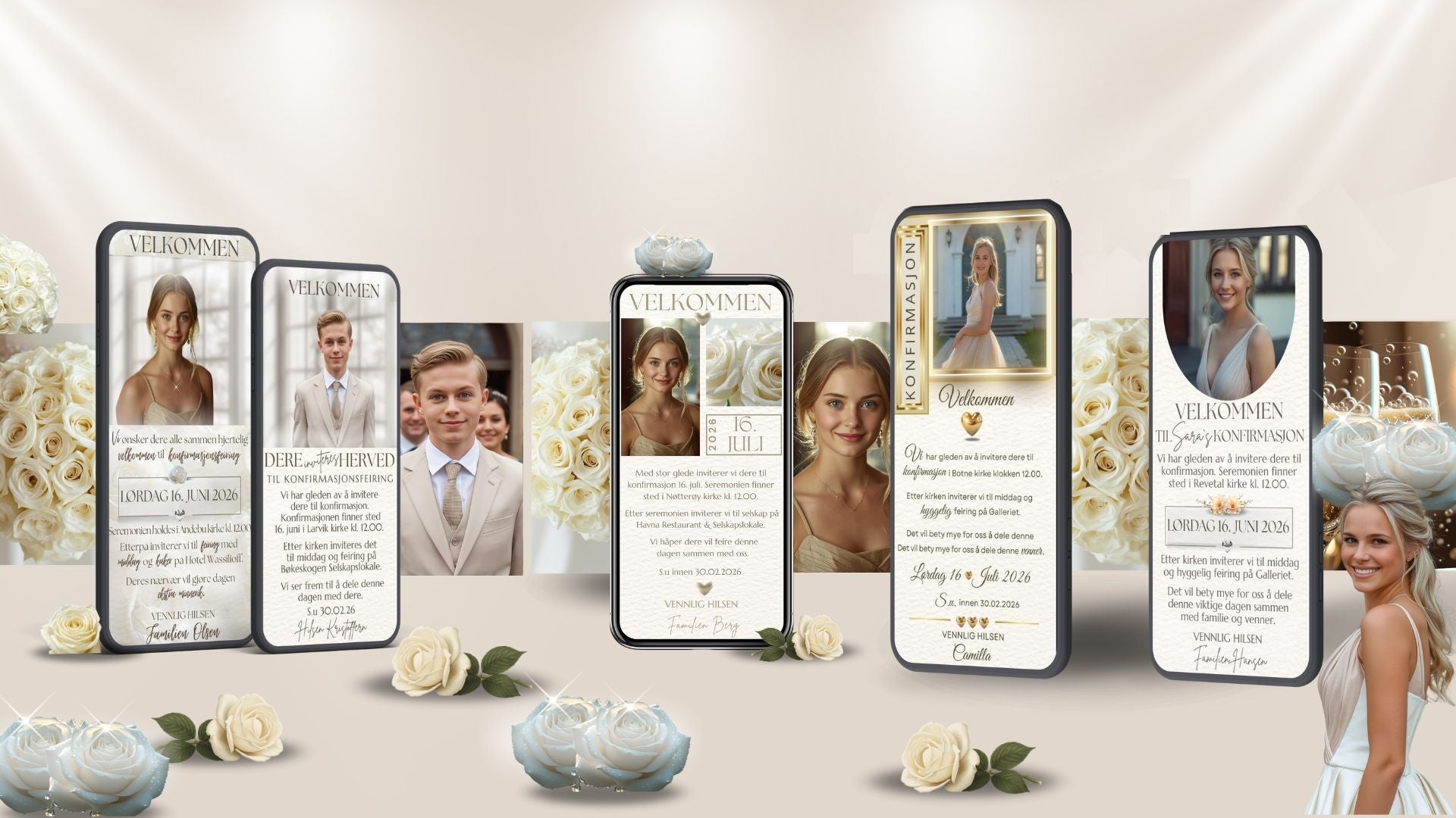En personlig invitasjon setter en fin tone for konfirmasjonen, og familie og venner setter stor pris på å bli invitert på en gjennomtenkt måte. Våre konfirmasjonsinvitasjoner leveres digitalt, slik at gjestene får dem rett på mobilen og alltid har dem lett tilgjengelig. Et bilde av konfirmanten gir invitasjonen et ekstra personlig preg, og vi anbefaler å sende den ut i god tid.