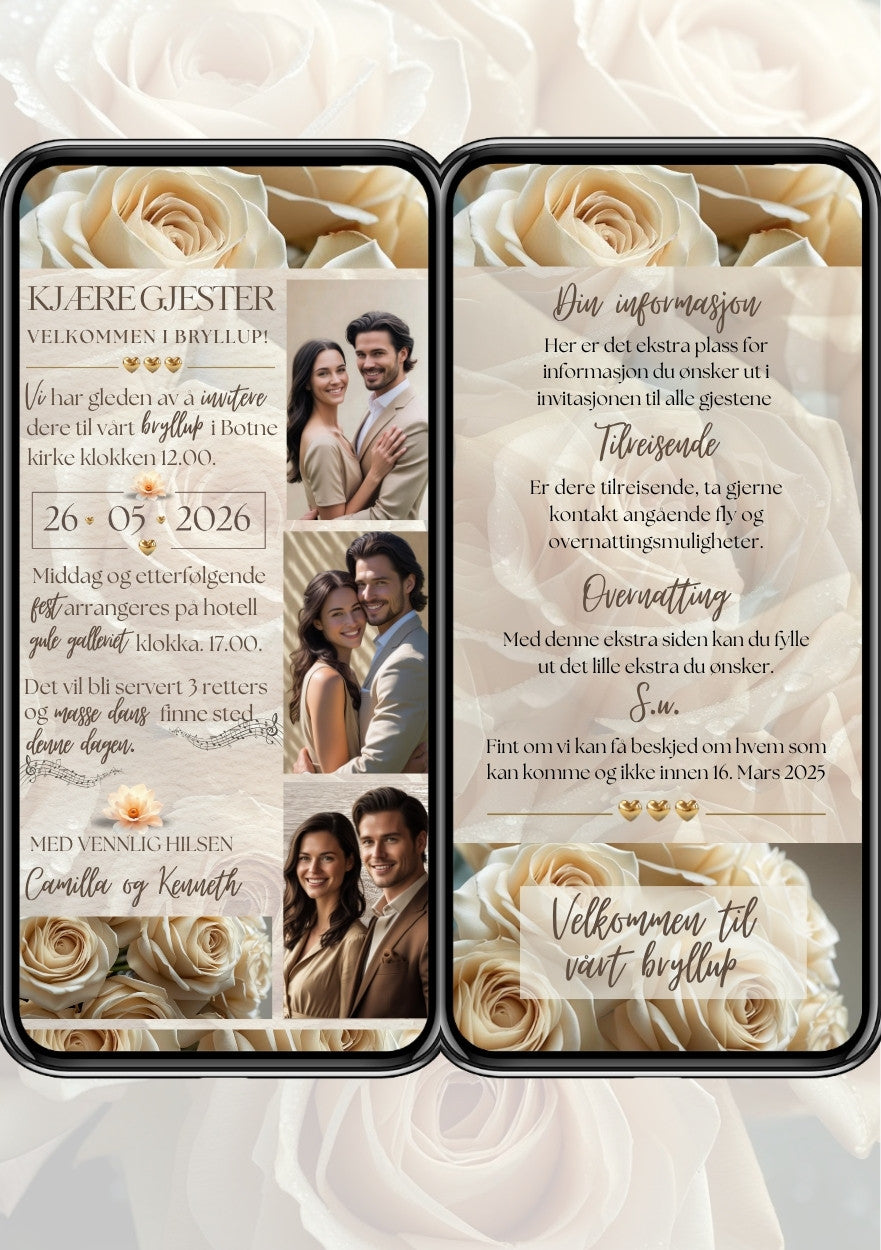 2 siders bryllups invitasjon. Har du en del informasjon til vil ha ut til alle Bryllupsgjestene har du plass til dette på doble invitasjoner for bryllup