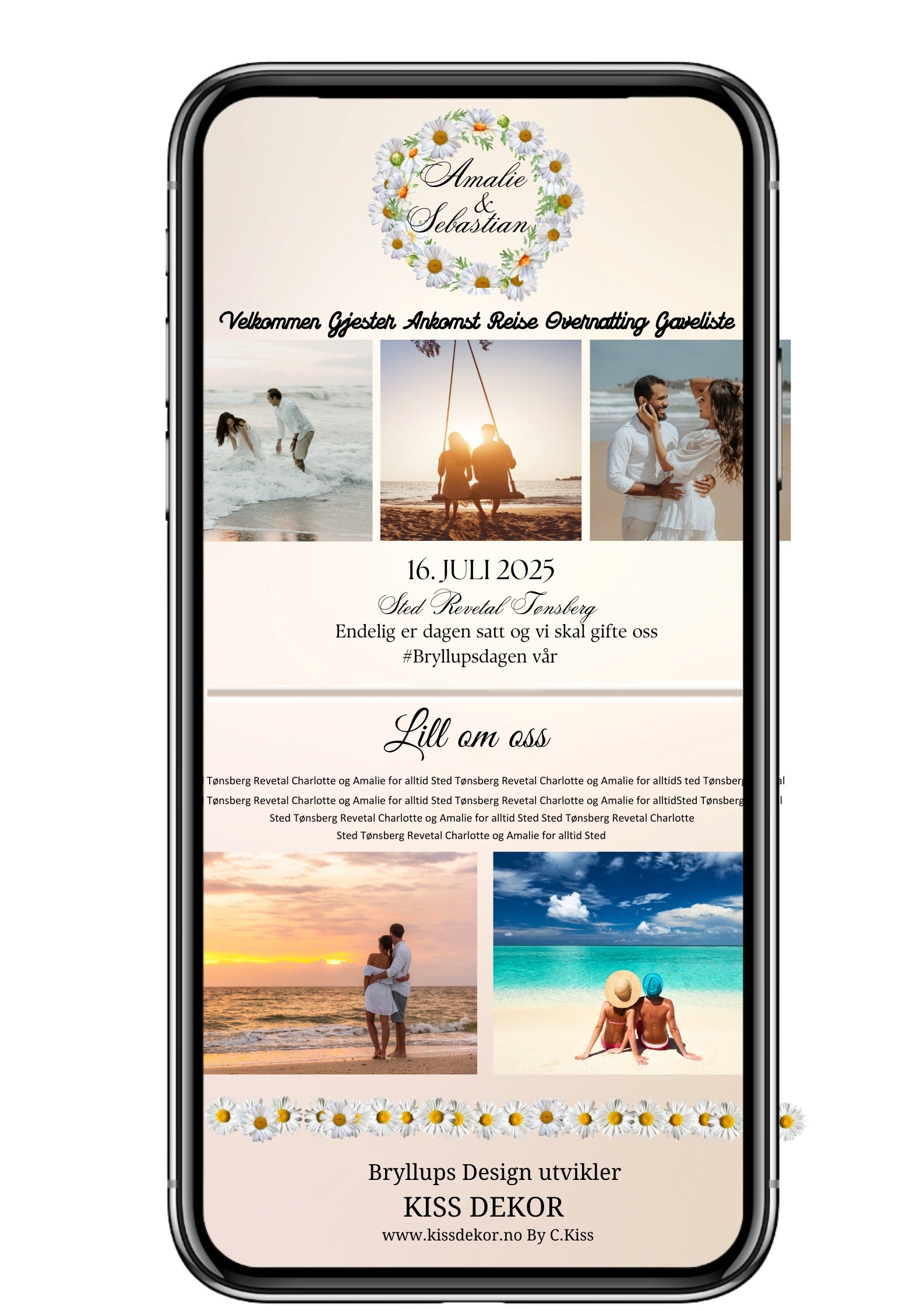 Send enkelt ut bryllupsinformasjon til gjestene med lenker til det dere ønsker å dele, som bryllupsnettside, gaveliste, kart til bryllupssted (Google Maps), overnatting og annen nyttig informasjon.