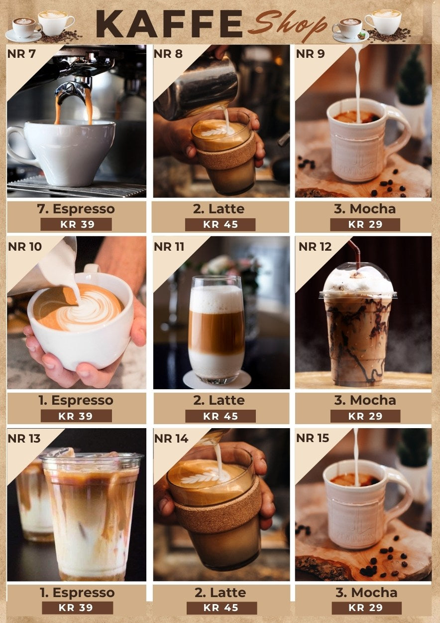 Last ned digitale prislister for din bedrift. Tilpasset din kafé– send inn tekst, få ferdig fil innen 1 virkedag!