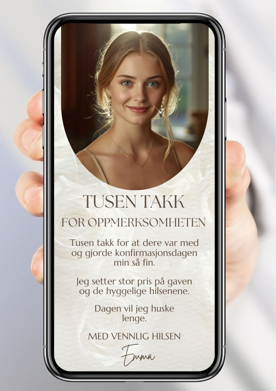 - Takkekort i valgt størrelse, tekst, design og eget bilde.