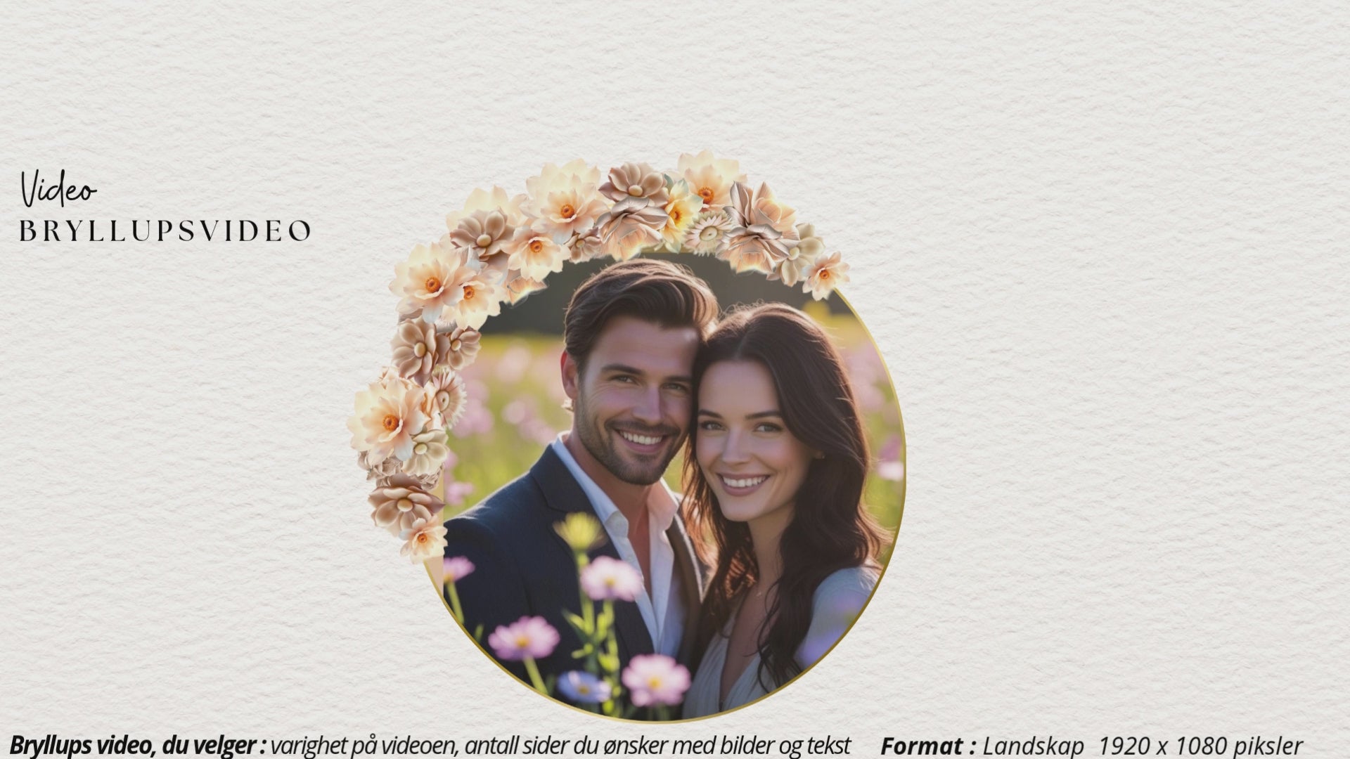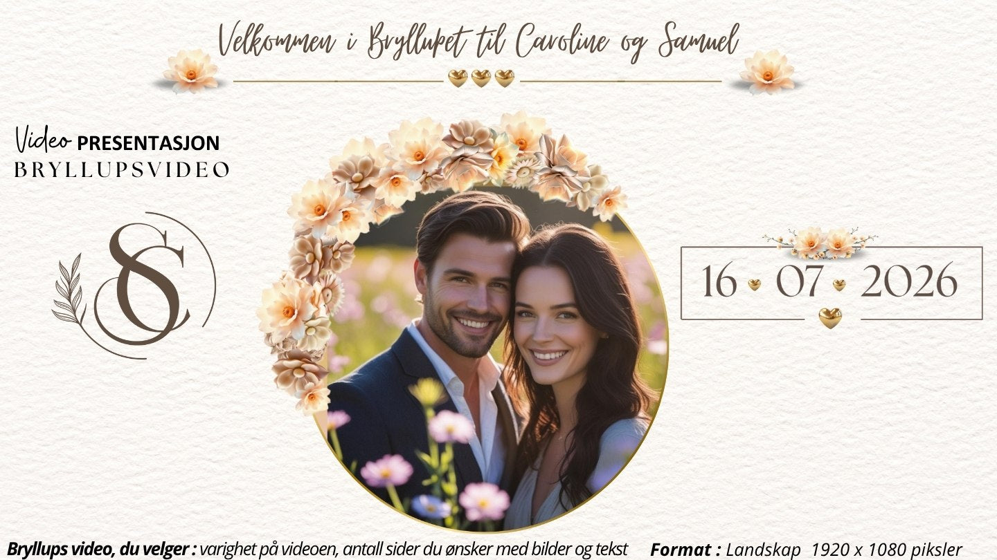 Dette er en tilpasset video, som betyr at du får videoen laget med dine egne bilder og tekst i valgt design. KISS DEKOR klargjør og tilpasser videoen spesielt til deres bryllup.