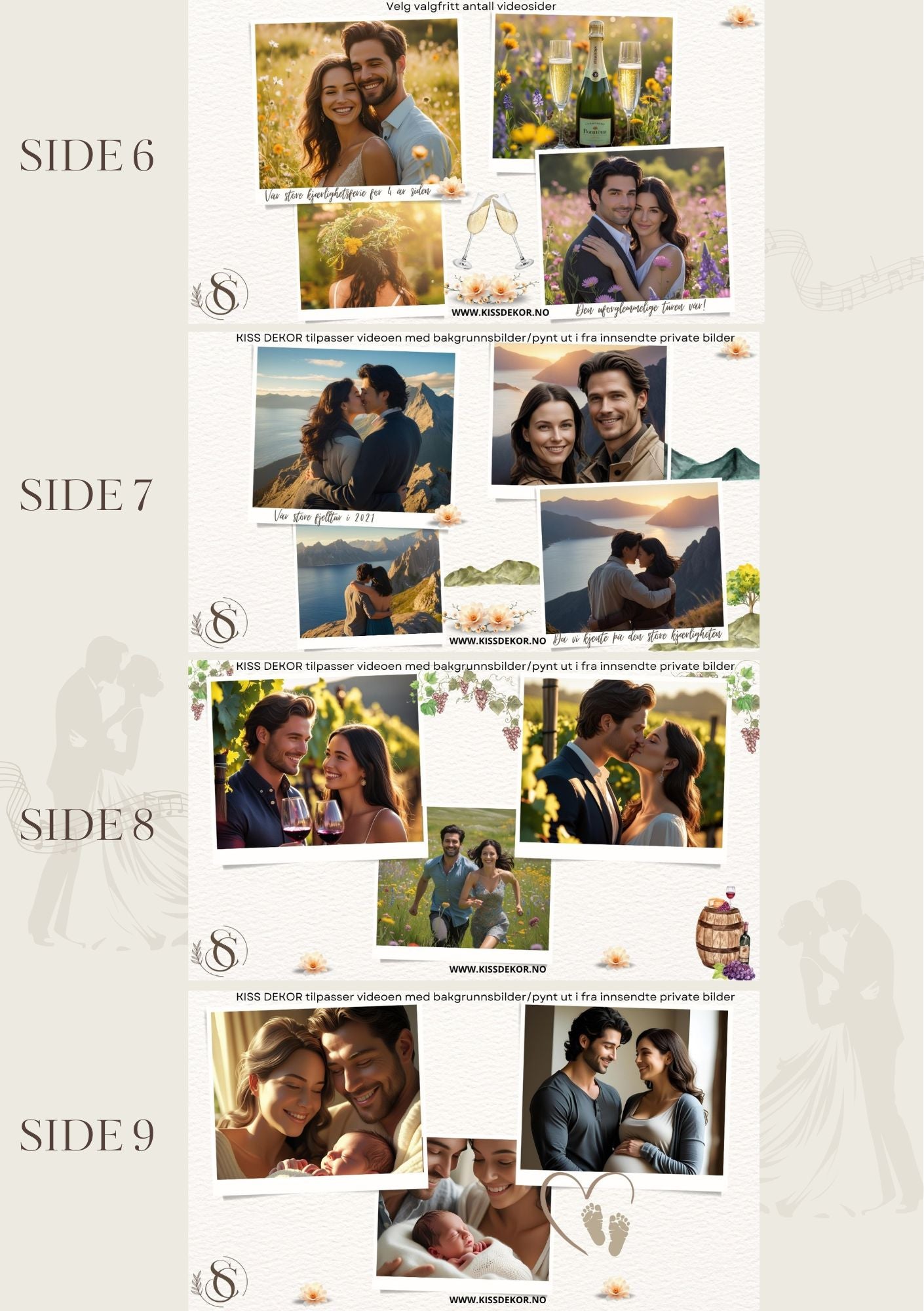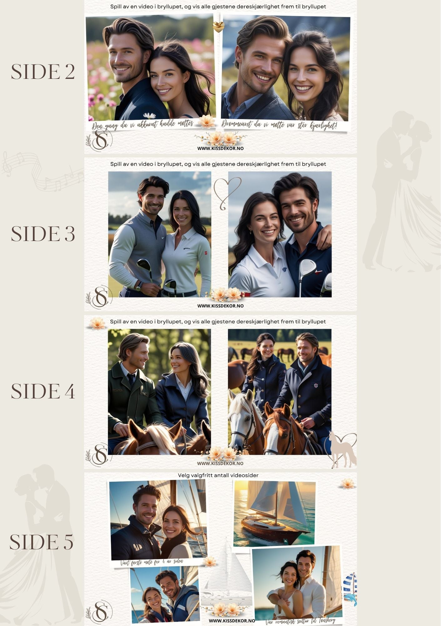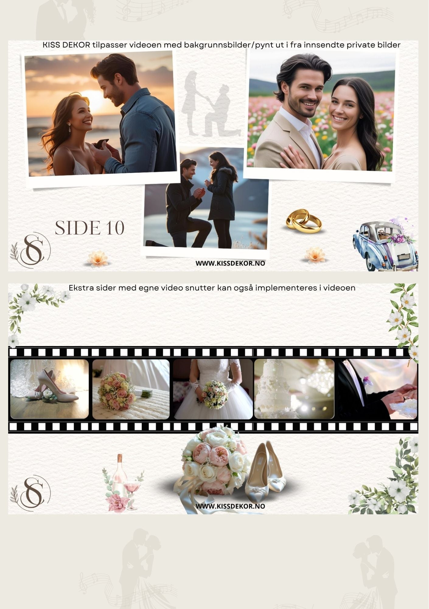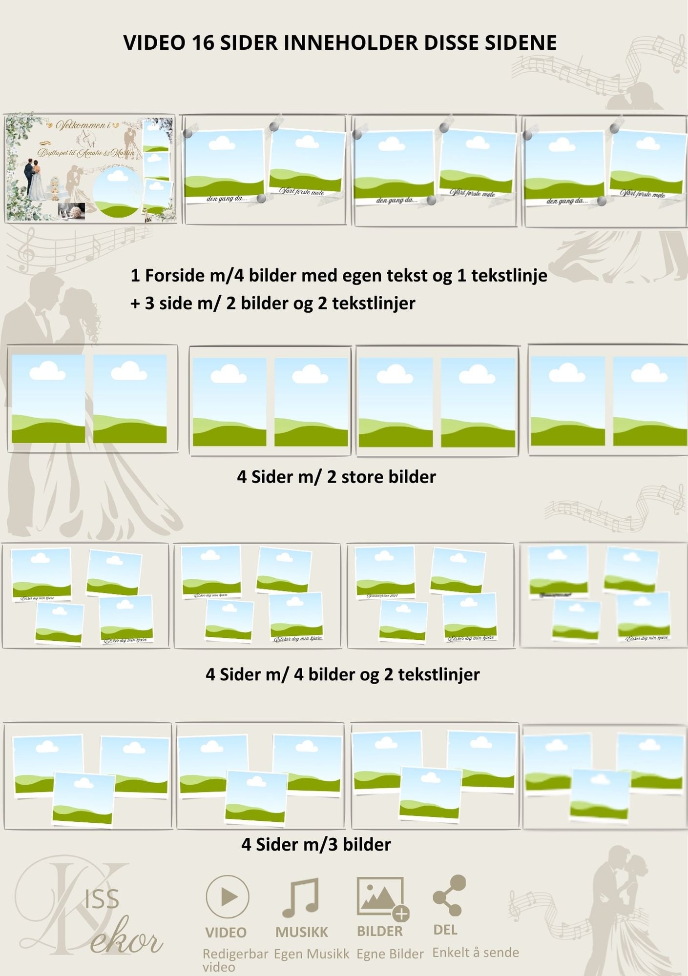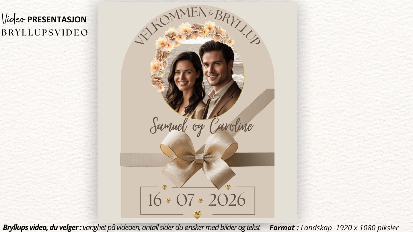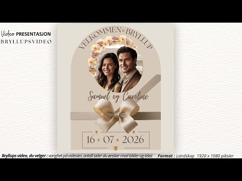 Dette er en tilpasset video, som betyr at du får videoen laget med dine egne bilder og tekst i valgt design. KISS DEKOR klargjør og tilpasser videoen spesielt til deres bryllup.